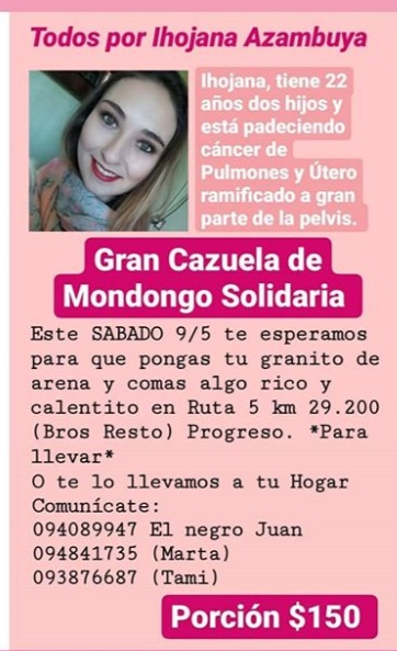 Juan Azambuya- Así es, todo lo recaudado será a beneficio de mi sobrina porque necesita medicamentos que son de alto costo. Además tiene 2 hijos, uno de ellos de 4 meses que ahora no puede amantar por el tema de la quimioterapia entonces decidimos ayudarla de esta manera porque dinero no tenemos y es lo único que podemos hacer. Cuando una familia se enfrenta a una enfermedad como el cáncer no hay dinero que alcance.