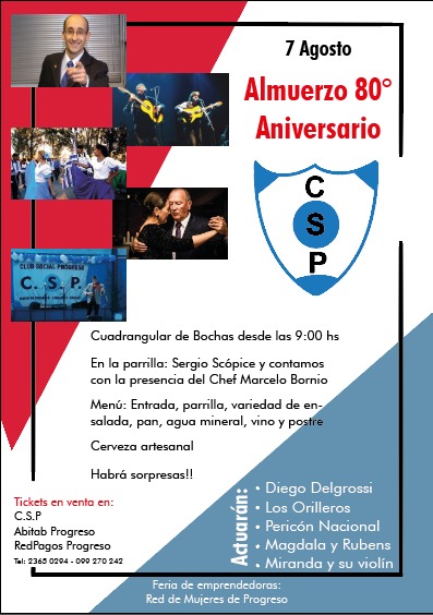 La misma comenzará en la mañana con un cuadrangular de bochas, luego continuará con el clásico almuerzo aniversario y para culminar la velada habrá espectáculos en vivo con la actuación de los artistas Diego Delgrossi, Los Orilleros, Pericón Nacional, Magdala y Rubens y Miranda y su violín; además se desarrollará una feria de emprendedoras organizada por la Red de Mujeres de Progreso.
